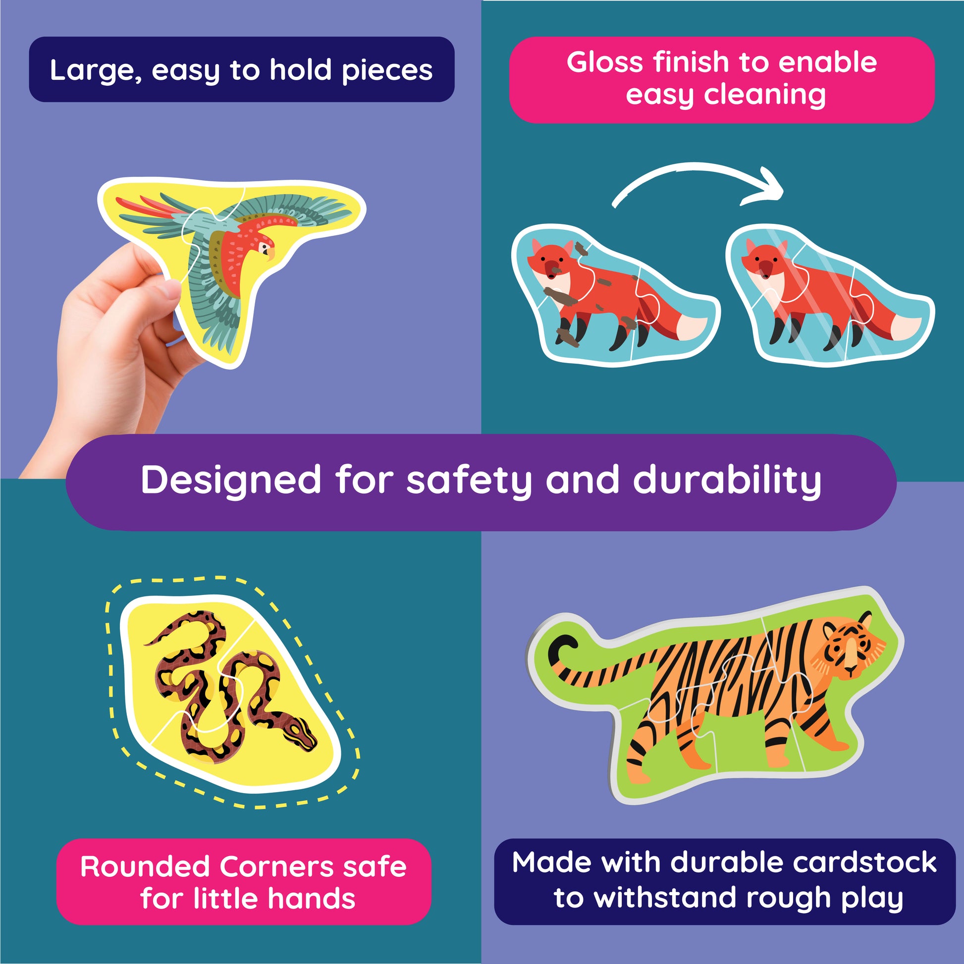 Introducing 'My First Puzzle' - the perfect introduction to the captivating world of puzzles for your little one. This Montessori-inspired toy is designed to foster early cognitive development and problem-solving skills. With 12 carefully graded puzzles, ranging from easy 2-piece puzzles to more challenging 5-piece puzzles, your child can embark on a journey of accomplishment and confidence-building. As they progress through each level, they'll experience a sense of achievement and a growing love for puzzles. 'My First Puzzle' is not just a toy, but a gateway to a lifelong passion for learning and exploration. Crafted with high-quality materials and vibrant colors, this set is sure to captivate your child's imagination and provide hours of engaging playtime. Unlock the joy of puzzles with 'My First Puzzle' and watch your little one's problem-solving abilities blossom.