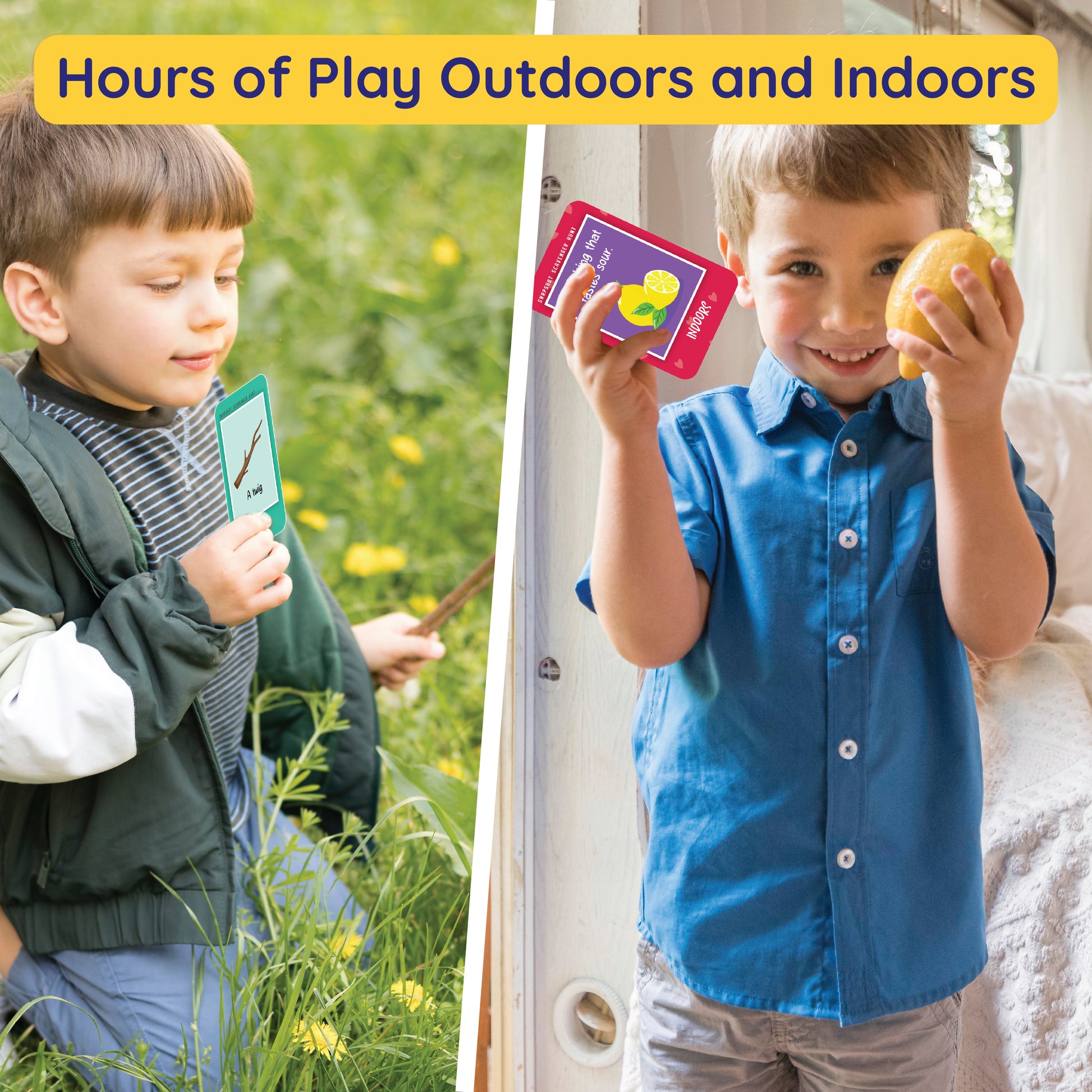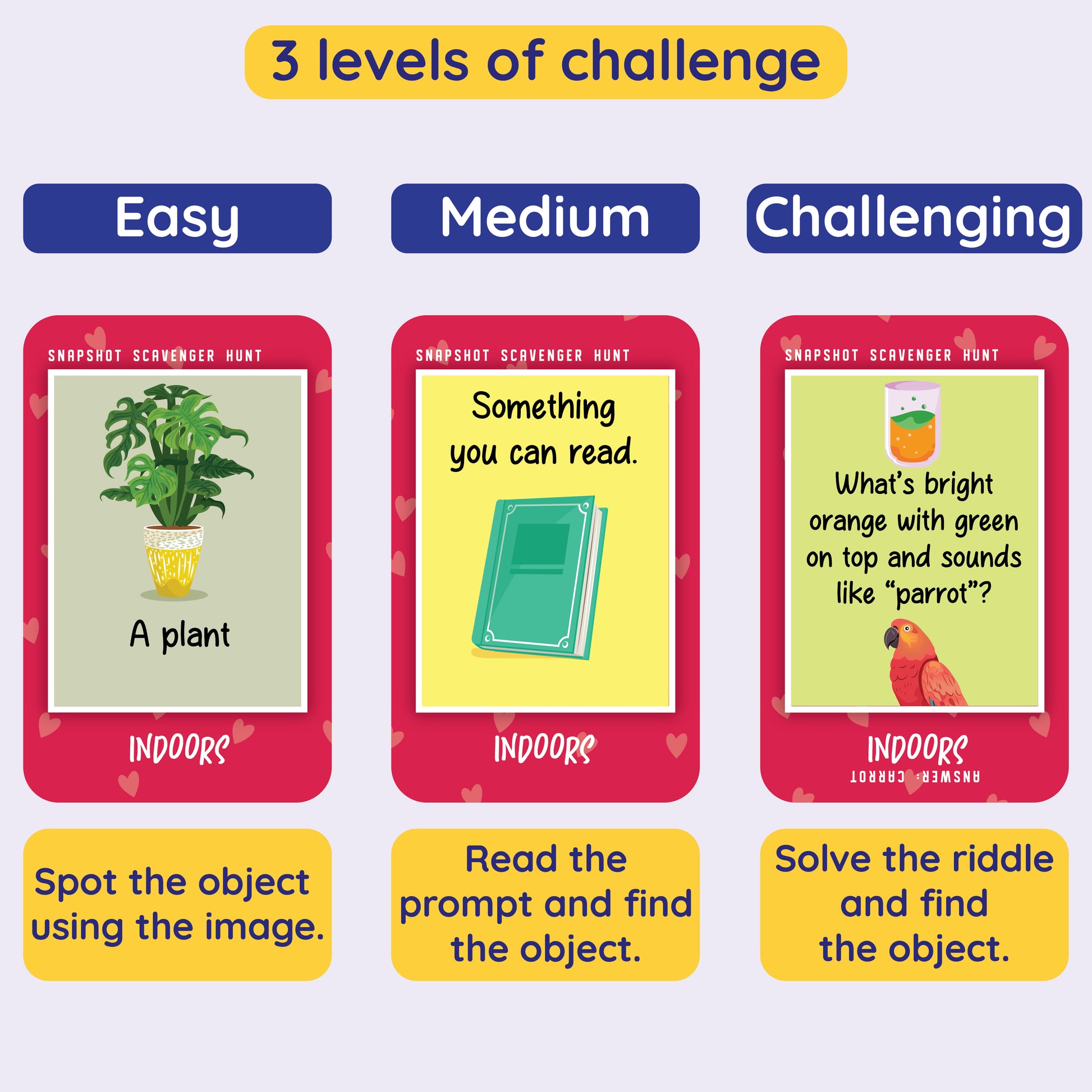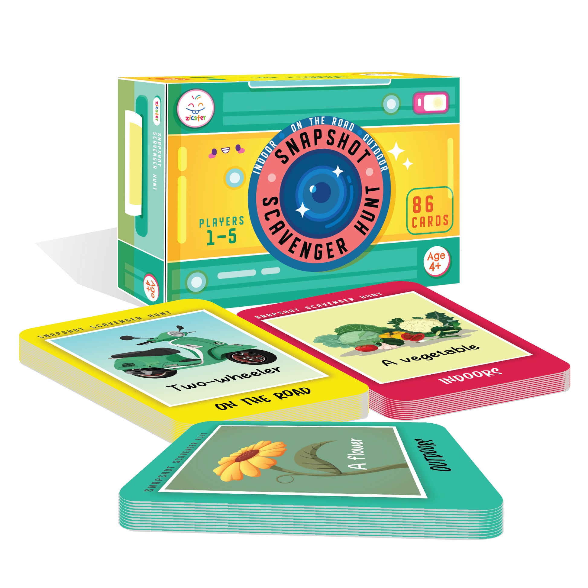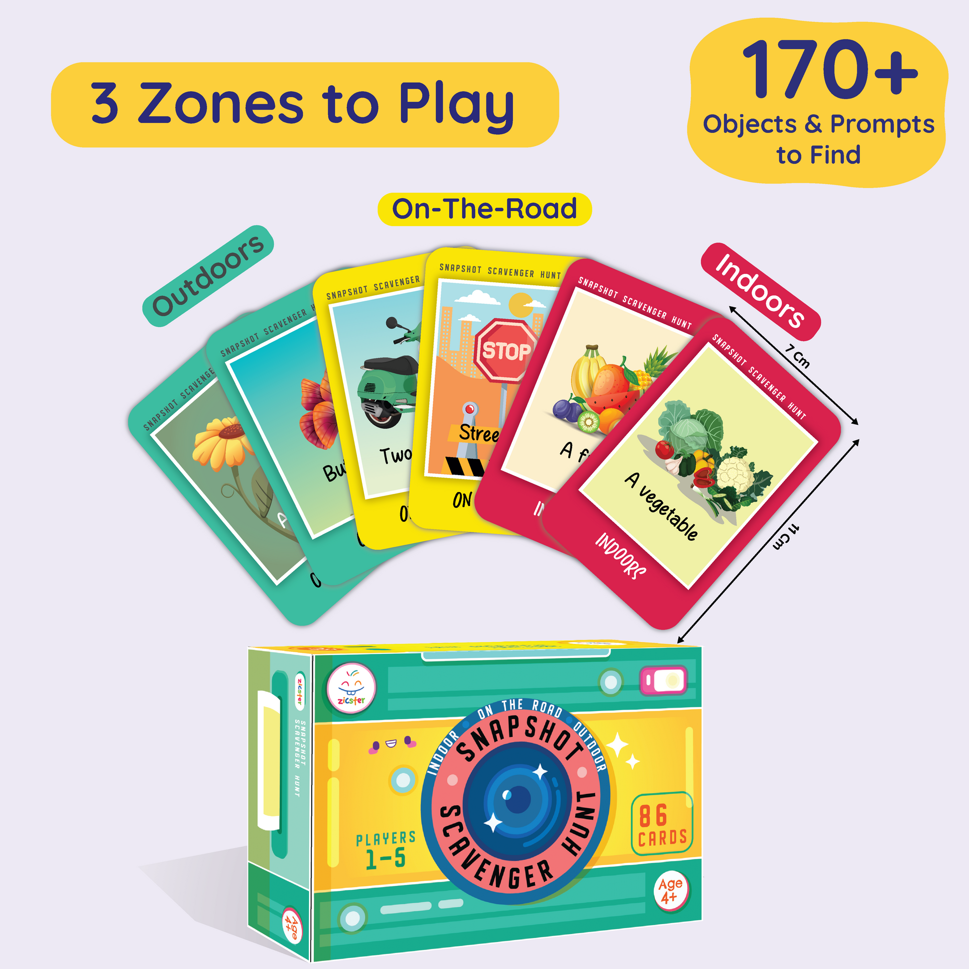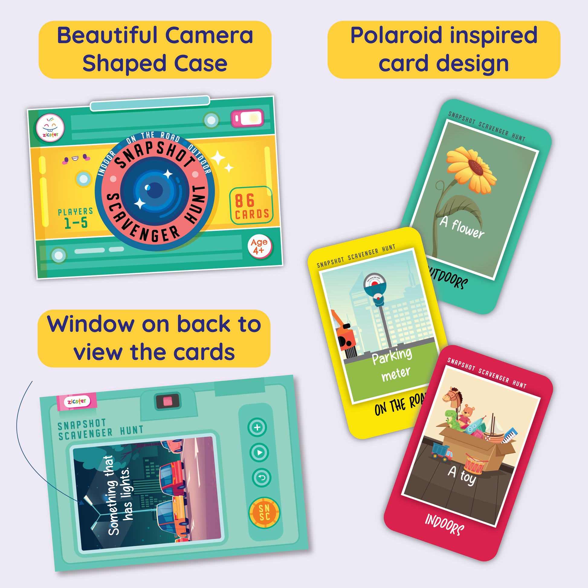 Snapshot Scavenger Hunt is an scavenger hunt game that provides educational fun for the whole family. Players are given prompts to find everyday household items like "something with a pattern" or "an object smaller than their palm". The excitement builds as kids rush around searching high and low to be the first to locate what's been described. Once an item is found, they shout out the name of the object to claim the card. The player who collects 7 cards first wins. As an award-winning activity, it gets kids away from screens for quality family bonding time through interactive learning.